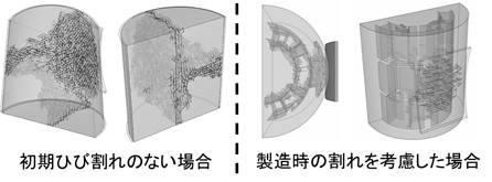 この解析では、オーバーパックの腐食膨張及び変形によって生じるガラス固化体の破砕に対して、FDEM(有限個別要素)法による数値解析を行い、ひび割れの形成過程や表面積の増大の程度を定量的に評価しました。結果は下図のようになり、この手法を用いれば、性能評価上重要な形状変化を算出できることが分かりました。