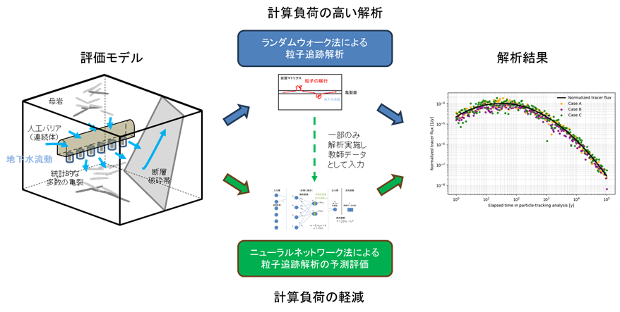 安全評価で分析する核種の移行挙動は、処分施設の状態(形状や透水性、拡散特性等)と、地下岩盤の状態(岩種分布、及び各岩種での亀裂分布や透水性、拡散特性等)で規定される。当分析にはランダムウォーク法を用いた粒子追跡解析を行う必要があるが、この分析は計算負荷が非常に大きいことが課題である。そこで、教師あり機械学習の手法の1つであるニューラルネットワークを用いて、処分施設や岩盤の状態を説明変数として、取得したい粒子の移行挙動(移行率)を目的変数として、一部のランダムウォーク解析結果をもとに、他の解析結果を予測評価するツールを開発した。