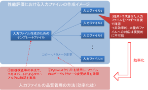 そこで弊社では、性能評価における入力ファイルを作成する際に、操作元のテンプレートファイルについては目視検査等の手法でエキスパートによるマニュアル的な確認を行い、操作後の入力ファイルについてはファイルのコピーや書き換えが適切に行われているかどうかをPythonスクリプトで確認する、という方法で効率的に入力ファイルの品質管理を行っている(下図参照)。