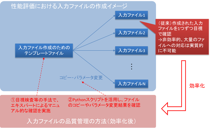 そこで弊社では、性能評価における入力ファイルを作成する際に、操作元のテンプレートファイルについては目視検査等の手法でエキスパートによるマニュアル的な確認を行い、操作後の入力ファイルについてはファイルのコピーや書き換えが適切に行われているかどうかをPythonスクリプトで確認する、という方法で効率的に入力ファイルの品質管理を行っている(下図参照)。